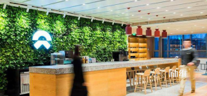 在展厅中除对富含科技型的汽车与蔚来的理念实行展现也引入了动物墙作为润饰元素,经过天然的绿色动物幕墙加蔚来白色logo的结合,为展厅的体验者也供给了花圃式的生态展厅。