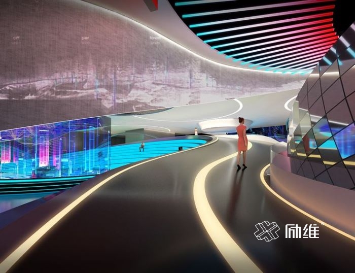 有时候单靠材质和造型,空间会显得很生硬,适当通过冷暖灯光的运用,会让展览空间变的更有层次感。