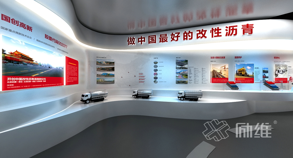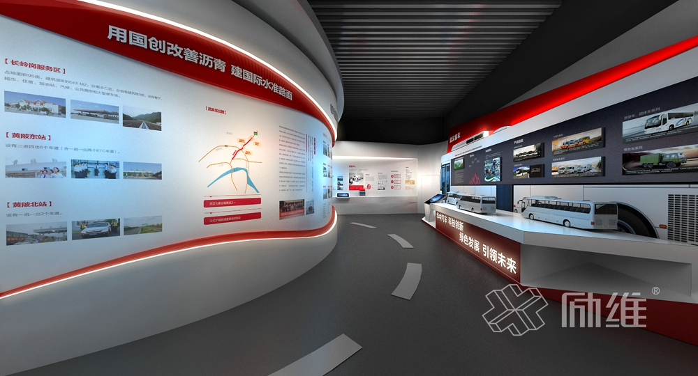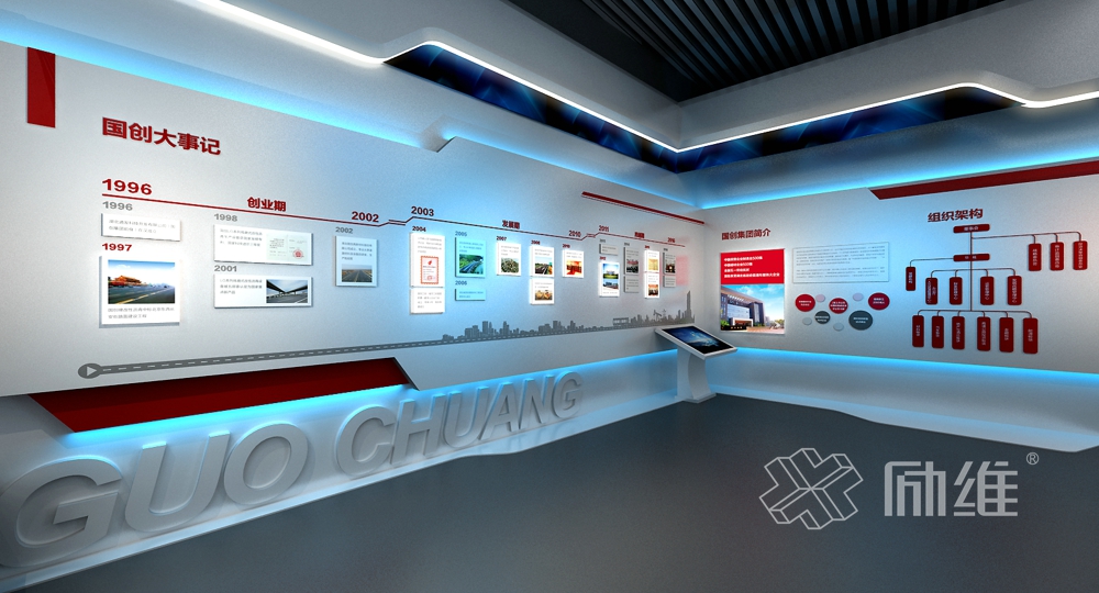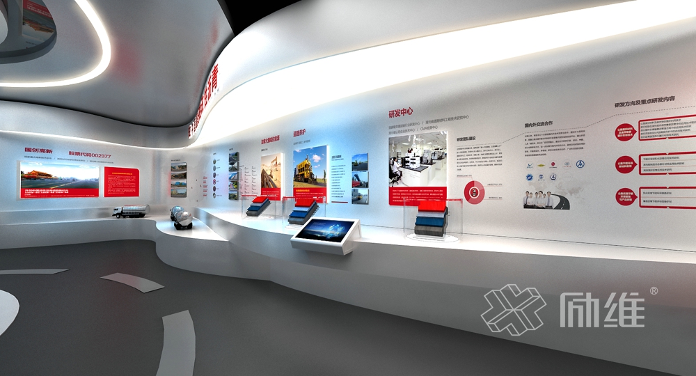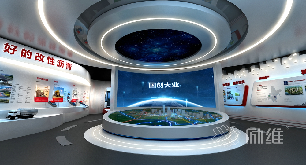 以大气沉稳、现代简约的总体基调,引入国创集团行业的市场特性,通过道路流线的灵动感整体布局,在延伸的空间演绎出国创每一条道路的精彩。整个展厅内容由民族骄子、创新勃发、聚力腾飞、使命有责、致远前行5大部分内容组成,遵循虚实结合、动静结合、远近结合的基本原则,突出“创新、务实、诚信、进取”国创精神。