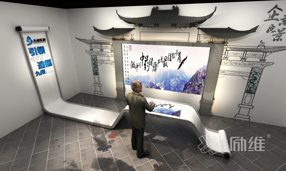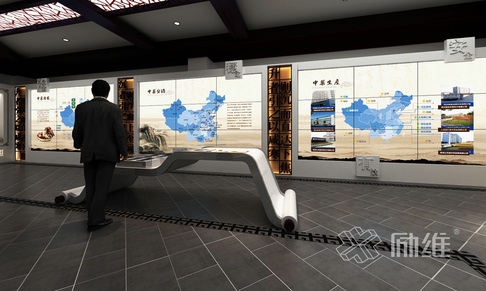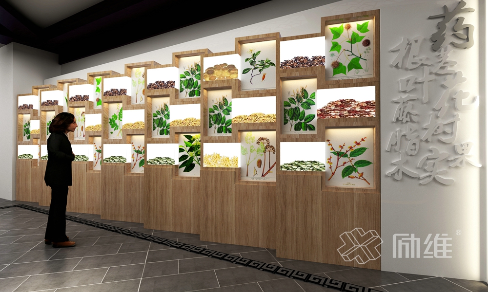 为彰显九州天润强大品牌后盾和处于湖北中药行业的领军地位,为此将展厅打造成行业一流的中医药文化标杆展厅。在整体风格设计上以熟褐色深化历史,赭石烘托中药气息,以药柜、药铺、药桌、药斗、药簸箕等重要元素的运用衬托中药文化底蕴。在策略思路上通过两条脉络线:企业历史发展线、中药文化发展线串联整个展厅的布展空间,形成前厅、发展、中药、饮片、文化、未来六大展区,演绎“仁济千金、德行百贵”的布展主题。