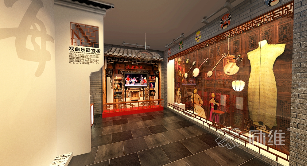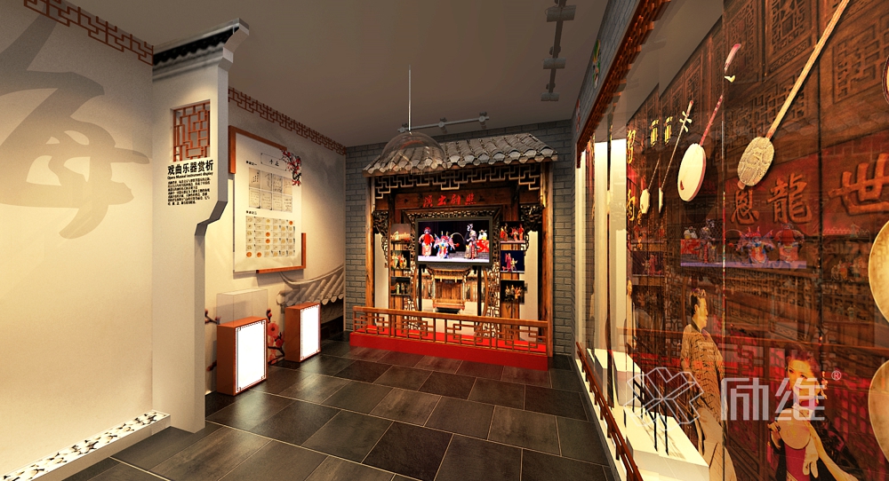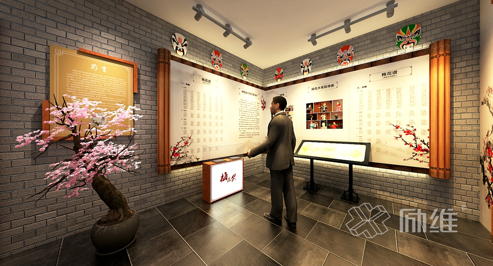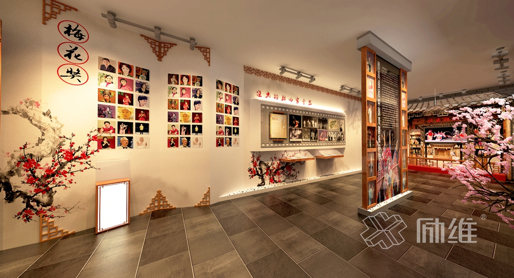 展厅设计旨在打在一个集观赏、品鉴、宣传于一体的功能性艺术空间,以“数点梅花天地心”为设计主题来展示文化艺术内涵。分为梅花赞、梅花颂、梅花叹三大展区,梅花赞是对梅花奖引领戏曲发展的赞美;梅花颂是对梅花奖获奖者精神和作品的歌颂;梅花叹则是通过对作品的回忆和惊叹。在设计理念上采用引景、造景的设计理念,以窗前观景,厅中觅花打造景中景,梅花情,使观者通过眼观、心赏、意会,领悟梅花奖所蕴含的“梅花香自苦寒来”的曲剧精神。