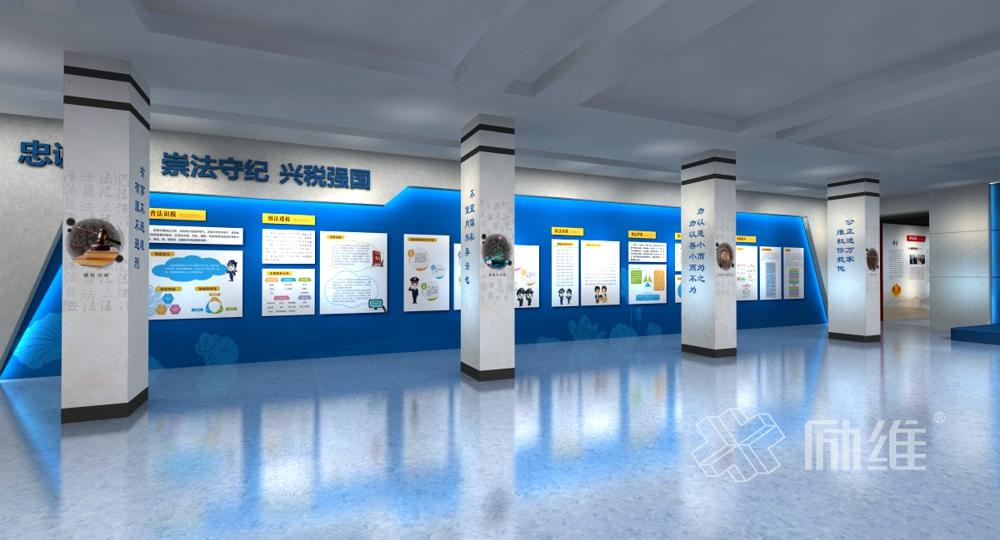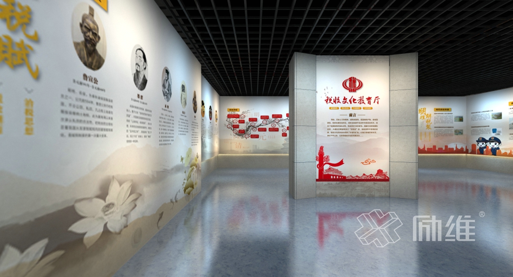为推动石首国税系统法治税务建设的大格局,展馆在空间设计及功能规划上体现税风凝练的新场所、税法宣传的新阵地、税企交流的新平台、税务知识学习的新渠道、国税形象实力展示的新媒介,在创意设计上体现地方特色、税务特质、法治特性、时代特点、互动特征,故将展馆设计成现代化多功能文化教育基地。以“聚税魂·汇民心·铸铁军”的策展思路展示税收溯源、税法科普、税石纪要、税务联创、税知讲堂,演绎多功能的法治教育税务课堂。