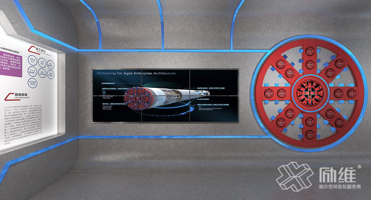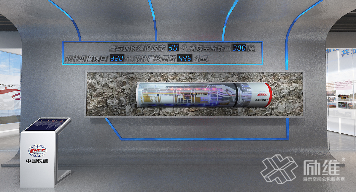 作为具有央企背景的专业盾构施工企业,在装备实力及施工能力方面有着行业领先的优势,该展厅充分结合行业特点,模拟地铁隧道内环境打造创意、具有企业特色的展厅空间,使参观者在参观的同时感受到企业光辉的盾构之路,同时根据展厅空间合理规划新媒体,在展项运用和设备安装方面突破重重难关,生动的再现出企业针对不同复杂地层的盾构技术和布局全国的盾构里程,彰显了企业不畏艰险、勇攀高峰的实力与担当。